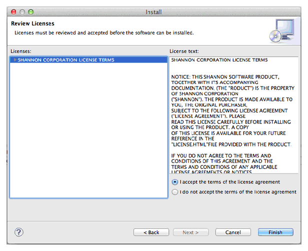- Read the license agreements and then select I accept the terms of the license agreements. Click Finish.