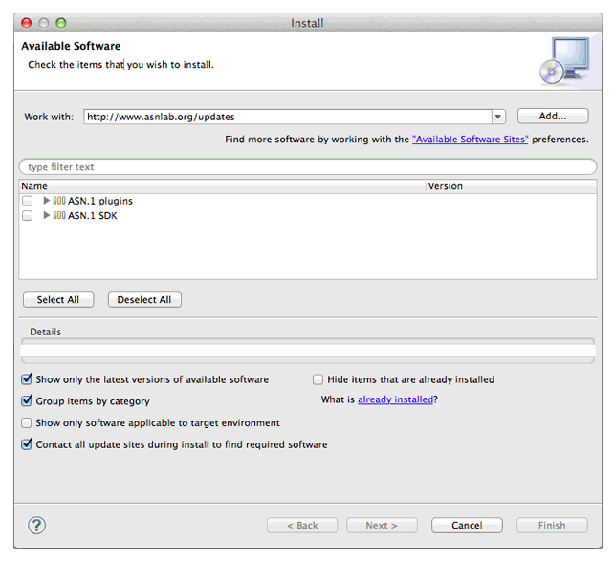 You should see the center box filled with ASN.1 SDK and ASN.1 plugins.